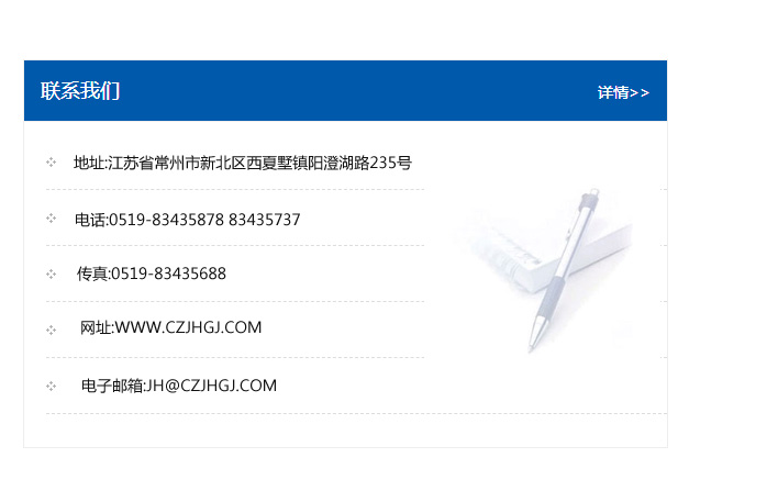 地址:常州市新北區友邦商務大廈1幢16、17層  電話:0519-85101652  傳真:0519-85112595  郵編:213022  網址:www.cz-jiayue_cn.cia-chengdu.com  郵箱:xiajifengaa@163.com